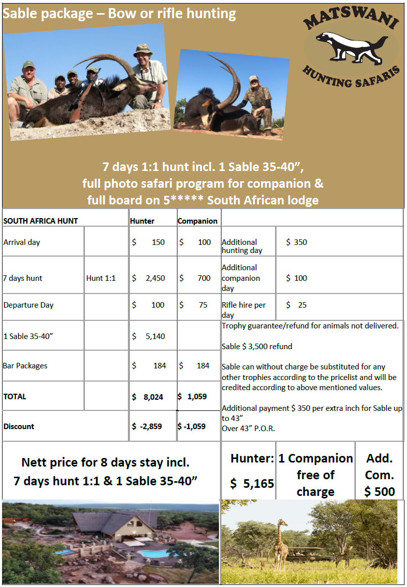 Den 5 stjernes lodgen ligger vakkert til i midten av Waterberg fjellene. De enornme jaktområdene er tilgjengelige innenfor en times kjøring fra lodgen. Dette avhenger av hvilke antilopearter en ønske å jakte på. Området har varierte biotoper. Dagen legges opp sammen med din egen profesjonelle jeger med sporere.