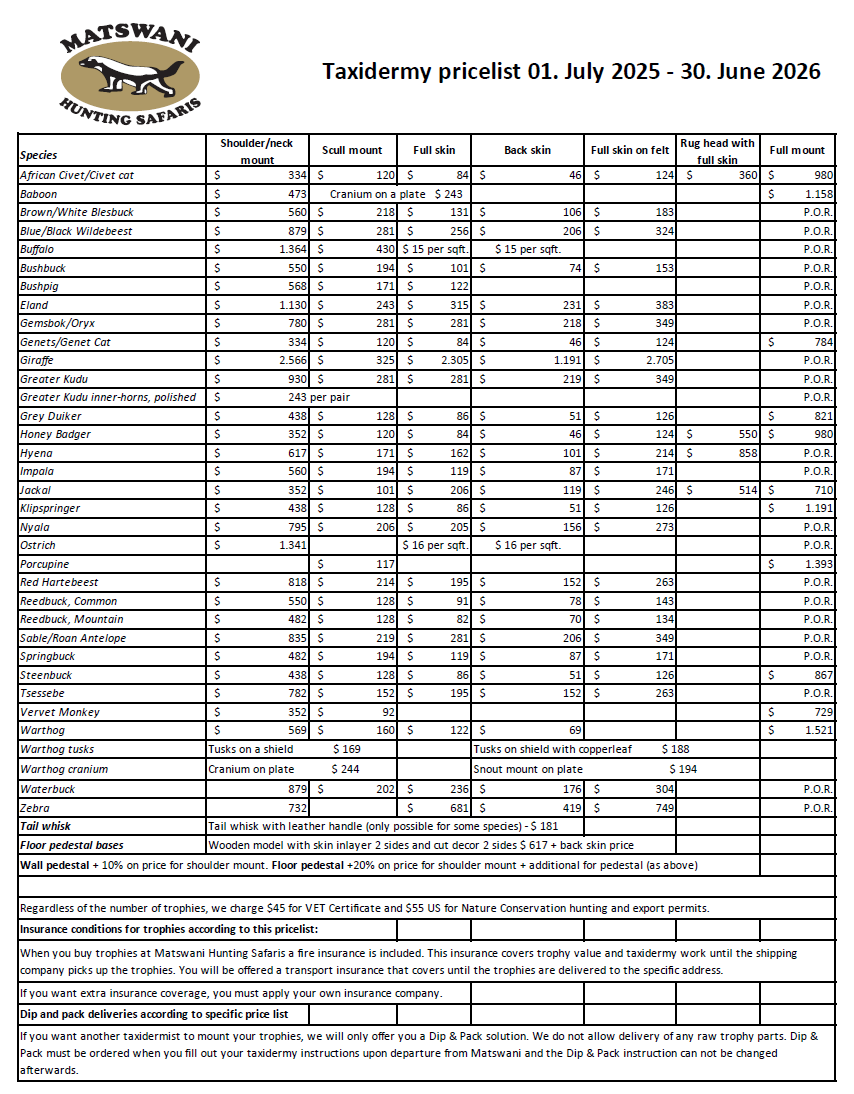 - Servicepakke ang taxidermist arbeide og organisering av eksport og hjemsendelse ved autorisert fraktefirma
