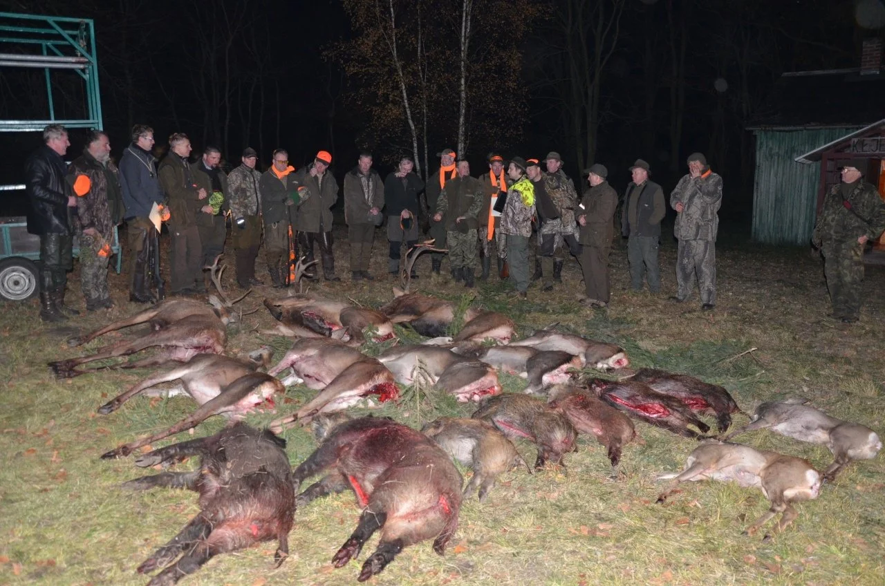 I vårt tilbud har vi inkludert følgende dyr under denne jakten: 3 hannhjorter opptil 3,49 kg pr dag pr gruppe ved flere enn 18 jegere. Lavere antall jegere 2 per dag. På våre jakter alle villsvin uansett størrelse og kjønn. Tenner fra hanngris større enn 12 cm vil bli kokt for jegeren. Hunndyr av hjort og rådyr. Dette statlige området ligger nordvest fra byen Katowice sør i Polen. Det er fire forskjellige områder på totalt ca 46000 HA og ca 30000 HA er dekket med forskjellig vegetasjon og myrer. I disse områdene skytes det hvert år mer enn 200 villsvin, 550 hjorter, og ca 600 rådyr. I et av områdene skytes det også ca 60 dåhjorter. I løpet av en dag er det ca 4 - 6 drev ved hjelp av profesjonelle drivere og hunder. Normalt I disse områdene blir det felt fra 10 – 30 dyr pr dag litt avhengig av skyteferdigheter, vær og jaktlykke. Områdene passer godt for grupper på ca 20 jegere. Normalt er overnattingen på fine hoteller i jaktområdet litt avhengig av hvilke av områdene som benyttes. De serverer god mat fra friske ingredienser. Meget sannsynlig vil hotel: www.resortstrzelnica.pl